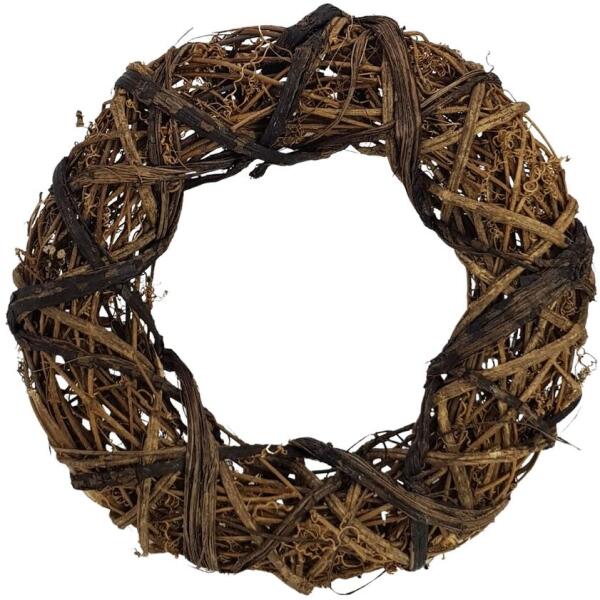 Fém váz alapú, masszív, barna indákkal körbetekert koszorú. Egzotikus és látványos koszorúalap, ami könnyedén díszíthető és beleillik a tavasztól őszig tartó összes szezonális dekorációba.